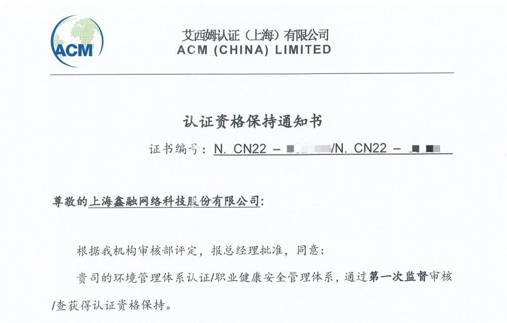 近日,鑫融網絡在環境保護和員工健康安全方面再次獲得行業認可。環境管理體系認證和職業健康安全管理體系認證是衡量一個企業在環境保護和員工健康安全方面表現的重要標準。艾希姆認證(上海)有限公司對鑫融公司的環境管理體系和職業健康安全管理體系進行了現場監督審核,并確認其順利通過審查,繼續保持認證資格。鑫融網絡