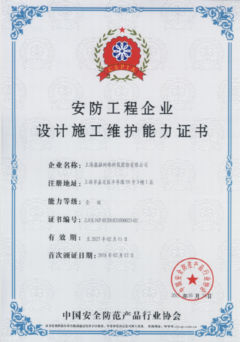 近日,鑫融網絡再次成功通過了中國安全防范產品行業協會的資質審核,順利續期安防工程企業設計施工維護能力一級證書!安防工程企業設計施工維護能力一級證書是中國安全防范產品行業協會對安防企業綜合實力的高度認可。該證書的獲得要求企業在安防工程的設計、施工和維護方面具備高度的專業性和豐富的經驗,同時需通過嚴格的