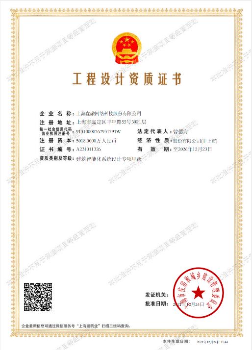 繼2021年5月鑫融網(wǎng)絡(luò)的電子與智能化工程專業(yè)承包一級資質(zhì)順利續(xù)證后,其智能化系統(tǒng)設(shè)計專項(xiàng)甲級資質(zhì)再次成功續(xù)證。智能化系統(tǒng)設(shè)計專項(xiàng)甲級資質(zhì),由上海市住房和城鄉(xiāng)建設(shè)管理委員會核準(zhǔn)發(fā)證,對申請獲證企業(yè)的資歷、信譽(yù)、技術(shù)條件、人員配備及管理水平等各方面都提出了較高的要求,屬于行業(yè)內(nèi)**資質(zhì);該資質(zhì)的取得,亦體現(xiàn)