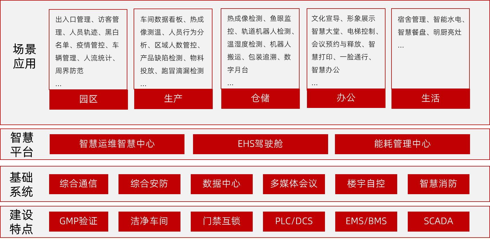大園區(qū)綜合管理,包括產(chǎn)線、辦公區(qū)、倉庫、生活區(qū)、公共區(qū)域中對人、車、物的精細(xì)化管控。